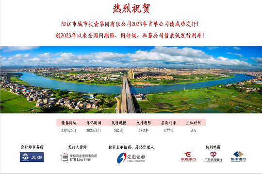 2024年1月19日,市城投集團(tuán)在深圳證券交易所成功發(fā)行“陽江市城市投資集團(tuán)有限公司2024年面向?qū)I(yè)投資者非公開發(fā)行公司債券”。本期債券發(fā)行規(guī)模為5.5億元,期限為5(3+2)年,票面利率3.10%,全場認(rèn)購倍數(shù)超過4.8倍,是...