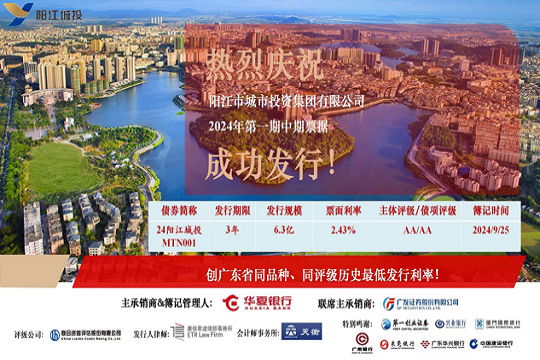 2024年9月26日,市城投集團(tuán)在中國銀行間交易商協(xié)會(huì)成功發(fā)行“陽江市城市投資集團(tuán)有限公司2024年第一期中期票據(jù)”。本期債券發(fā)行規(guī)模為6.3億元,期限為3年,票面利率2.43%,全場倍數(shù)超過2.52倍。本期債券創(chuàng)下了廣東省同...